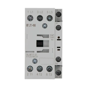 Leistungsschütz, Anwendung: Leistungsschütz für Halbleiterindustrie nach SEMI F47, Leistungsschütze bis 150 A mit elektronischer Betätigung, Gebrauchskategorie: AC-1: Nicht oder leicht induktive Lasten, Widerstandsöfen, NAC-3: Käfigläufermotoren: anlassen, während Betrieb ausschalten, AC-4: Käfigläufermotoren: anlassen, Einstecken, reversieren, Tippen, Anschlusstechnik: Schraubklemmen, Hinweise: Geeignet auch für Motoren der Effizienzklasse IE3., IE3-fähige Geräte sind mit dem Logo auf der Verpackung gekennzeichnet., Bemessungsbetriebsstrom AC-3, 380 V, 400 V: Ie= 18 A