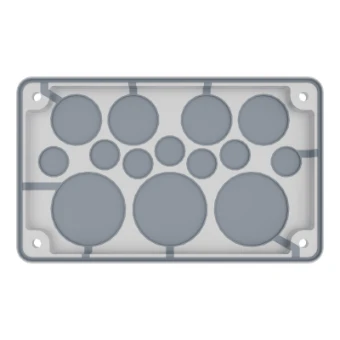 Durchsteckbare Flanschplatte aus isolierendem Zweikomponenten-Kunststoff, bestehend aus einer Hart- und Weichkomponente für hervorragende Leitungseinführung, die umlaufende Dichtung um den Flansch ermöglicht besten IP-Schutz zum Gehäuse, 7xØ3–20 mm, 4xØ3–32 mm, 3xØ3–50 mm