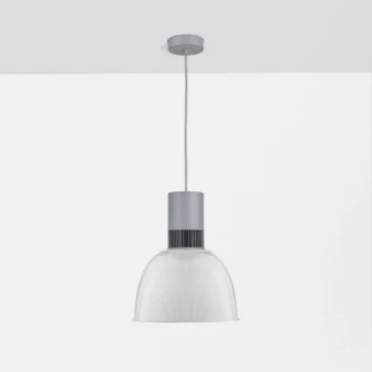LED hangarmatuur in een industriële uitstraling, gemaakt van gegoten aluminium. Voorzien van een Philips LED SLM & driver. Geleverd met Ø400mm prismatische polycarbonaatkap. Pendellengte van 3m.