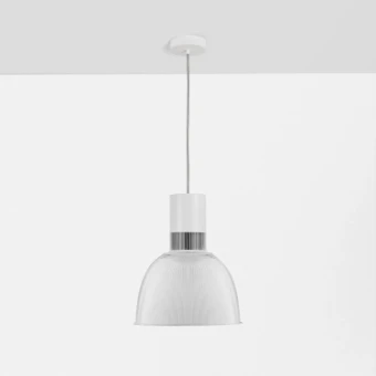 LED hangarmatuur in een industriële uitstraling, gemaakt van gegoten aluminium. Voorzien van een Philips LED SLM & driver. Geleverd met Ø400mm prismatische polycarbonaatkap. Pendellengte van 3m.