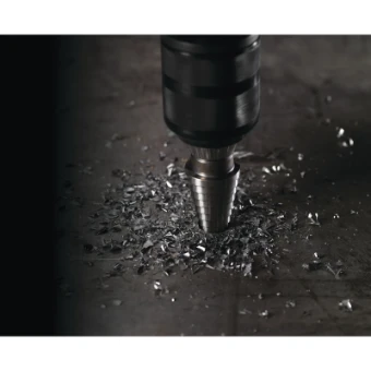 Stufenbohrer sind ideal zum Bohren in folgenden Materialien: legierte und unlegierte Bleche, Profile und Rohre. Kupfer, Messing und Aluminium. Edelstahl. Kunststoff. Maximale Materialstärke 4 mm. Zur Erhöhung der Standzeit wird der Einsatz von Kühlmitteln empfohlen. Gewerke: Elektriker: Bohren von Platten und Schaltschränken für Kabelinstallationen. SHK: Zugangslöcher zu Rohren und Leitungen. Metallbearbeiter: Bohren verschiedener Durchmesser und Vergrößerung von Löchern. Automotiv: Löcher für Kabelinstallationen (Handys, Antennen, Verlegen von Kabeln). Instandhaltung: verschiedene Anwendungen, Größen und Bohrlochvergrößerungen. Vorteil von Stufenbohrern gegenüber herkömmlichen Bohrern: Ein Bohrer für unterschiedliche Durchmesser. Optimale Lösung zum Vergrößern von Bohrlöchern. Bruchsicherer als Metallbohrer. Leichtes Zentrieren. Sauberer und gratfreie Löcher. Splitterfreies Bohren in Kunststoff. Ankörnen, Bohren und Entgraten in einem Schritt Rapid Strike Bohrspitze für leichteres Zentrieren kein "Wandern" des Bohrer und schneller Bohrfortschritt, ohne Vorbohren. Spezielle Bohrspitze sowie eine spezielle Stufengeometrie ermöglichen ein ratterfreies Bohren. Geringeres Risiko, bei hohen Drehzahlen zu verkanten oder das zu bohrende Material zu verformen. Optimierte 2-Spiral-Geometrie mit geschärften Kanten für bis zu 2x schnelleren Bohrfortschritt. Hergestellt aus Spezialstahl mit schwarzer Oxidbeschichtung für bis zu 4x längere Lebensdauer. Optimiert für den Einsatz mit Akkuwerkzeugen. Lasermarkierung der Durchmesser für langanhaltende Lesbarkeit. Jede Stufe ist hintergeschliffen für optimalen Bohrvorschub und automatisches Entgraten. Schaft mit 3 Spannflächen für sicheren Halt im Bohrfutter und optimale Kraftübertragung.