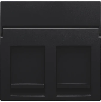 Abdeckung für 2 RJ Ausgänge, flache Ausführung. Die Abdeckung hat ein transparentes Textfeld, in das Sie leicht Text oder Symbole einfügen können. Farbausführung: black coated.