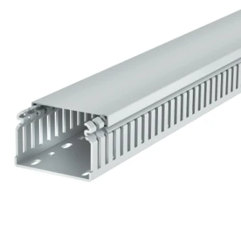 Halogenfreier Verdrahtungskanal nach DIN EN 50085-2-3 inkl. Oberteil und Bodenlochung zur waagerechten und senkrechten Verlegung elektrischer Kabel und Leitungen im Schaltschrank. Ausführung als DIN-Kanal. Das Ausbrechen der Stege erfolgt werkzeuglos. Bodenbündiges Ausführen ist durch Sollbruchstellen möglich. Geprüft nach DIN EN 50085-2-3. Sonderlängen auf Anfrage.