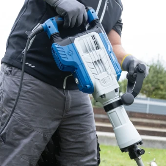 Scheppach sloophamer AB1900 met 1900 W, 60 Joule slagkracht en 2000 slagen per minuut is een echt krachtpatser. De sloophamer breekt moeiteloos door muren en beton. Dankzij de twee handgrepen met soft-grip en een netto gewicht van 16,5 kg ligt het apparaat tijdens het werk veilig in de hand. De AB1900 wordt geleverd met twee accessoires. Een puntbeitel en vlakbeitel. De set wordt geleverd in een praktische, verrijdbare koffer.