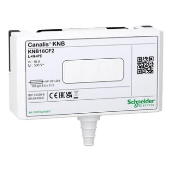 Dit is een eenfasige aftakeenheid met zekeringhouders voor Canalis KN-railkokersysteem met insteekcontacten. Het wordt gebruikt voor de snelle aansluiting van lasten of secundaire leidingen in overeenstemming met de installatienormen IEC 60364 en voorschriften betreffende TT, TNS en TNC-aardingssystemen. Het is uitgerust met een faseselectiesysteem (L1, L2 of L3 + N + PE). De nominale bedrijfsstroom is 16A. De nominale bedrijfsspanning is van 230 VAC tot 500 VAC 50/60 Hz, afhankelijk van de beveiligingsinrichting. De UPS is uitgerust met een zekeringhouder voor cilindrische NF-zekeringen van het type 8,5x31,5, gG of aM (zekeringen niet meegeleverd). De polariteit van de aftakeenheid is L+N+PE, ontkoppeling door uittrekken. De deur/afdekking kan aan de voorkant open zijn. De aftakeenheid kan loodverzegeld zijn om te voorkomen dat onbevoegden de stroomonderbreker schakelen. Het is geschikt voor TT-, TN-S- en TN-C-aardingssystemen. De kleur is wit RAL 9001. Kabelklem is meegeleverd. De ka