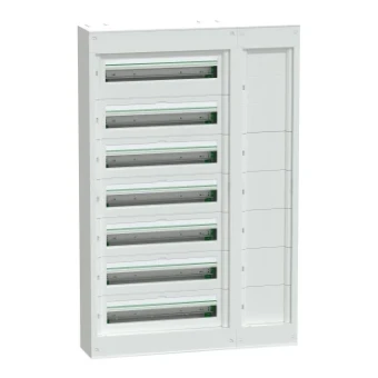 Dit Prismaset S-omhulsel is een opbouwmontage distributieomhulsel met een zijgoot links of rechts. Deze metalen en kunststof behuizing is samengesteld uit 7 rijen van 24 modules van 18mm. Het kan alle types van modulaire schakeluitrustingen omvatten. Het omhulsel en de zijgoot hebben een grotere ruimte op de eerste rij om de NSXm 160 binnenkomende stroomonderbreker of schakelaar aan te passen, indien nodig uitgerust met een aardlekbeveiligingsmodule. Dit omhulsel is bestemd voor installatie binnen. De IP-beschermingsgraad is IP41 met deur en IP30 zonder deur. Er kan een optionele deur over de behuizing worden geïnstalleerd. De kleur van de kast en de voorzijde is wit (RAL 9003). Dit gebruiksklare omhulsel is bedoeld voor gebruik in residentiële en tertiaire sectoren. Het is ontworpen voor elektriciens, en biedt ergonomie en flexibiliteit van de installatie. De kabels kunnen via de boven- of onderzijde van het omhulsel worden ingevoerd door verwijderbare kabelinvoerplaten. Het maakt inv