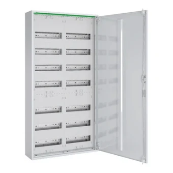 Deze PrismaSeT XL behuizing is een verdeelkast voor wandmontage. Deze metalen behuizing bestaat uit 2 velden van 7 rijen met 12 modules van 18mm. Het kan alle soorten modulaire schakelapparatuur huisvesten. Deze behuizing is bedoeld voor binneninstallatie. De IP beschermingsgraad is IP44. Het is voorzien van een volle witte deur. De kleur van de kast is wit RAL 9016. Het kan zij aan zij en op elkaar worden gecombineerd. Deze kast is bedoeld voor de residentiële en tertiaire sector. De kabels kunnen naar binnen via de boven- of onderkant van de behuizing. Er is een aarde en een neutraal klemmenblok in de behuizing begrepen. De elektrische isolatieklasse is klasse II (dubbel geïsoleerd). De nominale stroom In bedraagt maximaal 250 A. Dit product voldoet aan de norm DIN EN 61439-3. De totale afmetingen zijn 550 mm x 1100 mm x 170 mm (B).