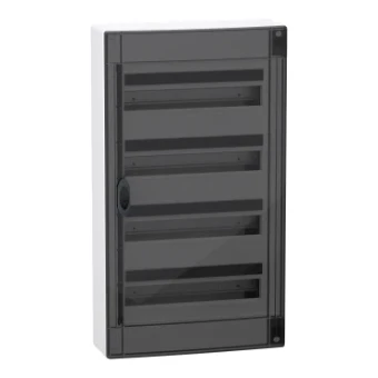 Deze Prismaset XS behuizing is een opbouwmontage distributiebehuizing. Deze kunststof behuizing bestaat uit 4 rijen van 18 modules van 18mm. Het kan alle types van modulaire schakeluitrustingen omvatten. Dit omhulsel is bestemd voor installatie binnen. De IP-beschermingsgraad is IP40 gesloten deur. Het is voorzien van een transparante rookdeur. De kleur van het omhulsel en de afdekplaat is wit (RAL 9003). Dit gebruiksklare omhulsel is bedoeld voor gebruik in residentiële en tertiaire sectoren. Het is ontworpen voor elektriciens, en biedt ergonomie en flexibiliteit van de installatie. De kabels kunnen via de boven- of onderzijde van het omhulsel worden ingevoerd door verwijderbare kabelinvoerplaten. Het maakt invoer via kabel, buis of koker mogelijk. Het is uitgerust met 1 achterplaat en 4 DIN rails. De rails zijn verwijderbaar en vereenvoudigen de bedrading en de onderhoudswerkzaamheden. Het wordt geleverd met 1 aardingsklemmenblok. Dit klemmenblok biedt 38 uitgangen (6x25mm²+32x4mm²).