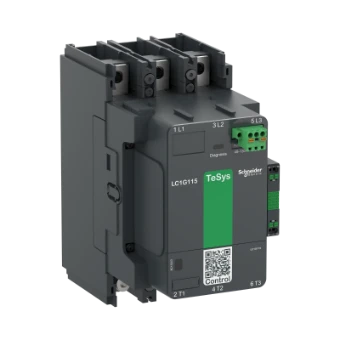 TeSys Giga hoge vermogenschakelaar, 3 polen (3 NO) geschikt voor categorie AC-3 toepassingen tot 150A 90kW@440V, uitgerust met 48-130V AC/DC breedband elektronische spoel met laag verbruik en ingebed zeer betrouwbaar 1NO+1NC hulpcontactblok (17V 1mA). Ontworpen voor veeleisende toepassingen met maximale bedrijfssnelheden tot 500 cycli per uur en omgevingen tot 60 °C. Het is gebouwd met een hoge betrouwbaarheid en biedt mechanische duurzaamheid tot 8 miljoen cycli. De diagnose van de Slijtage van het contact (CWD) is een standaardfunctie, Het systeem bewaakt en geeft continu feedback via gezonde en alarmcondities met behulp van een LED-indicator. Het is mogelijk om een schakelmodule (hoofdcontacten), een regelmodule die de levensduur van de schakelaar verlengt, te vervangen door eenvoudige onderhoudsactiviteiten. De aan de voorkant toegankelijke stroomaansluitingen zijn voorzien van bevestiging met bouten en besturingsaansluitingen van insteekklemmen, voor een eenvoudige en snelle assem