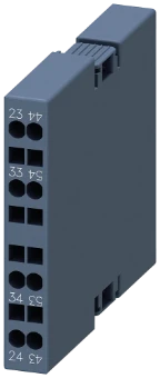 auxiliary switch, lateral, 2 NO, on the left: 43/44, 53/54, on the right: 23/24, 33/34, current path: 1 NO, 1 NO, spring-loaded terminal, for contactors 3RT2.1 auxiliary switch SIRIUS 3RH29 for the expansion of auxiliary contacts in the control circuit. 3RH29 auxiliary switches can be laterally mounted onto 3RT2 contactors without tools regardless of their size. The 3RH19/3RH29 auxiliary switches are available as versions for front or lateral mounting, with up to four instantaneous contacts or up to two leading NO and NC contacts. The auxiliary switches can be designed as positively driven contacts in 3RH contactor relays or also as mirror contacts in the case of3RT power contactors. All of them are available with screw terminal and spring-type terminal. Simple, efficient and always up to date - SIRIUS modular system.