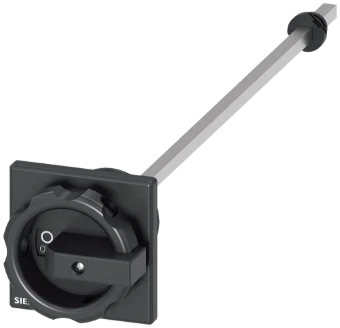 Door-coupling rotary operating mechanism black 66x66 mm, Front plate mounting Central hole mounting 22.5mm with coupling part with shaft 300 mm long, 6x6 mm, accessories for load disconnector 3LD3 Main and EMERGENCY OFF switch SENTRON 3LD3 for the safe shutdown of loads in many areas, e.g. for three-phase motors, air conditioning and ventilation systems, in control or switchgear cabinets, especially for small machines such as saws, compressors, pumps, concrete mixers, drilling machines, milling machines, or woodworking machines. Modular design, fast and easy mounting of auxiliary switches, N-PE terminal, or 4th pole. Optimum disconnection of 16 A of 63 A from the power supply due to the locking capability of the rotary operating mechanism. Versatile thanks to international approvals. One mechanical frame size for five electrical frame sizes. The 3LD main and EMERGENCY-OFF switches are available in a wide range of variants for front mounting, mounting plate, DIN rail, or installation in distribution boards, optionally with direct or door-coupling rotary operating mechanism. 3LD2 is also available in variants for DC applications. Main and EMERGENCY-OFF switch 3LD - End-to-end safety for users and systems.