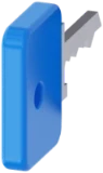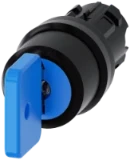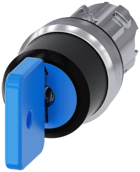 Key-operated switch O.M.R, 22 mm, round, metal, shiny, lock number 73038, blue, with 2 keys, 3 switch positions I-O-II, latching, actuating angle 2x45°, 10:30h/12h/13:30h, Key removal O Key-operated switches SIRIUS ACT for meeting higher demands for access security. Under the brand name SIRIUS ACT, Siemens offers a unique portfolio of pushbuttons and signaling devices with global product approvals in three modern design lines of rugged genuine metal and high-grade plastic.An innovative snap-on concept makes the task of installing a unit so easy that it can be done with one hand and without any special tools. Groove-free holes are adequate as mounting holes since full twist prevention isalready integrated.Thanks to the high degree of protection throughout, the rugged devices are suitable for use in industry and outdoors. Even cleaning with a high-pressure jet is possible. Neither dust, oils, nor caustic solutions can interfere with reliable operation.As well as standard wiring, the devices can also be connected to the controller via PROFINET, AS-Interface or IO-Link. Doing so will help you to reduce wiring time and effort, minimize error sources and have more flexibility.The graphical Online Configurator provides convenient support when selecting and ordering individual devices, enclosures and labels. Extensive documentation (e.g. manual, 3D data, terminal diagram) is available. Versions available: Various locking systems (Siemens, C; Siemens, B; RONIS, OMR), 2/3 switch positions, latching/momentary-contact operation, various key removal positions. Note: Single device, please order holders and modules separately. SIRIUS ACT - Performance in action for control and signalling. Simply mounted, simply strong, simply perfect.