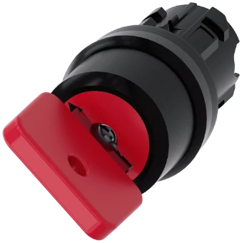 Key-operated switch O.M.R, 22 mm, round, plastic, lock number 73037, red, with 2 keys, 2 switch positions O-I, latching, actuating angle 90°, 10:30h/13:30h, Key removal O Key-operated switches SIRIUS ACT for meeting higher demands for access security. Under the brand name SIRIUS ACT, Siemens offers a unique portfolio of pushbuttons and signaling devices with global product approvals in three modern design lines of rugged genuine metal and high-grade plastic.An innovative snap-on concept makes the task of installing a unit so easy that it can be done with one hand and without any special tools. Groove-free holes are adequate as mounting holes since full twist prevention isalready integrated.Thanks to the high degree of protection throughout, the rugged devices are suitable for use in industry and outdoors. Even cleaning with a high-pressure jet is possible. Neither dust, oils, nor caustic solutions can interfere with reliable operation.As well as standard wiring, the devices can also be connected to the controller via PROFINET, AS-Interface or IO-Link. Doing so will help you to reduce wiring time and effort, minimize error sources and have more flexibility.The graphical Online Configurator provides convenient support when selecting and ordering individual devices, enclosures and labels. Extensive documentation (e.g. manual, 3D data, terminal diagram) is available. Versions available: Various locking systems (Siemens, C; Siemens, B; RONIS, OMR), 2/3 switch positions, latching/momentary-contact operation, various key removal positions. Note: Single device, please order holders and modules separately. SIRIUS ACT - Performance in action for control and signalling. Simply mounted, simply strong, simply perfect.