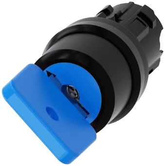 Key-operated switch O.M.R, 22 mm, round, plastic, lock number 73038, blue, with 2 keys, 2 switch positions O-I, latching, actuating angle 90°, 10:30h/13:30h, Key removal O Key-operated switches SIRIUS ACT for meeting higher demands for access security. Under the brand name SIRIUS ACT, Siemens offers a unique portfolio of pushbuttons and signaling devices with global product approvals in three modern design lines of rugged genuine metal and high-grade plastic.An innovative snap-on concept makes the task of installing a unit so easy that it can be done with one hand and without any special tools. Groove-free holes are adequate as mounting holes since full twist prevention isalready integrated.Thanks to the high degree of protection throughout, the rugged devices are suitable for use in industry and outdoors. Even cleaning with a high-pressure jet is possible. Neither dust, oils, nor caustic solutions can interfere with reliable operation.As well as standard wiring, the devices can also be connected to the controller via PROFINET, AS-Interface or IO-Link. Doing so will help you to reduce wiring time and effort, minimize error sources and have more flexibility.The graphical Online Configurator provides convenient support when selecting and ordering individual devices, enclosures and labels. Extensive documentation (e.g. manual, 3D data, terminal diagram) is available. Versions available: Various locking systems (Siemens, C; Siemens, B; RONIS, OMR), 2/3 switch positions, latching/momentary-contact operation, various key removal positions. Note: Single device, please order holders and modules separately. SIRIUS ACT - Performance in action for control and signalling. Simply mounted, simply strong, simply perfect.