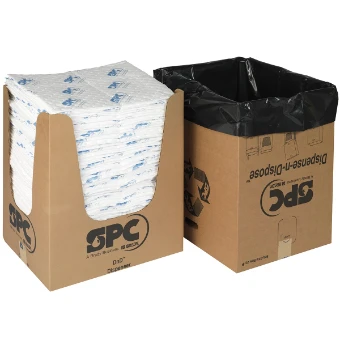 OP150-DND-E is een 2-laagse, witte, zware, gebonden en geperforeerde olieabsorberende doek die zowel olie als vloeistoffen op basis van petroleum absorbeert. Is waterafstotend. Het spinvlies aan één kant zorgt voor extra sterkte en minder pluisvorming. Geperforeerd: zo beperkt u de hoeveelheid afval en hebt u minder kosten voor afvalverwijdering. Geleverd met Dispense & Dispose-systeem: gemakkelijke toegang tot het product dankzij de handige dispenser, en het afval verdwijnt na de opruiming in afvalzakken en afvalbak. Het perfecte absorptiemiddel bij lekkages in de werkplaats. Ook geschikt voor algemeen dagelijks gebruik en voor het opruimen van occasionele lekkages.