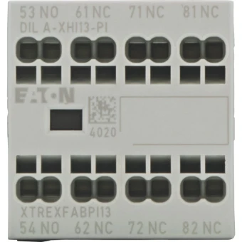 Hulpcontactblokje, met onderling vergrendelde tegenoverliggende contacten, functie: voor standaard toepassingen, 4-polig, aansluittechniek: Push-in klemmen, Ith 16 A, nominale bedrijfsstroom AC-15 220 V 230 V 240 V: Ie= 4 A, nominale bedrijfsstroom AC-15 380 V 400 V 415 V: Ie= 4 A, contacten no = normaal open: 1 no, contacten nc = normaal gesloten: 3 nc, type montage: Frontbevestiging, voor gebruik met: DILA…-PI, DILM7…-PI, DILM9…-PI, DILM12…-PI, DILM15…-PI, DILM17…-PI, DILM25…-PI, DILM32…-PI, DILM38…-PI, DILMP20…-PI, DILMP32…-PI, DILMP45…-PI, DILM8…-PI, DILM11…-PI, DILM14…-PI, type: Hulpcontact voor frontmontage