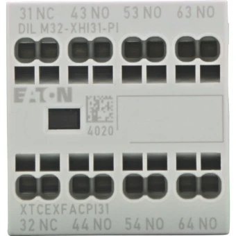 Hulpcontactblokje, met onderling vergrendelde tegenoverliggende contacten, functie: voor standaard toepassingen, 4-polig, aansluittechniek: Push-in klemmen, Ith 16 A, nominale bedrijfsstroom AC-15 220 V 230 V 240 V: Ie= 4 A, nominale bedrijfsstroom AC-15 380 V 400 V 415 V: Ie= 4 A, contacten no = normaal open: 3 no, contacten nc = normaal gesloten: 1 nc, type montage: Frontbevestiging, voor gebruik met: DILA…-PI, DILM7…-PI, DILM9…-PI, DILM12…-PI, DILM15…-PI, DILM17…-PI, DILM25…-PI, DILM32…-PI, DILM38…-PI, DILMP20…-PI, DILMP32…-PI, DILMP45…-PI, DILM8…-PI, DILM11…-PI, DILM14…-PI, type: Hulpcontact voor frontmontage
