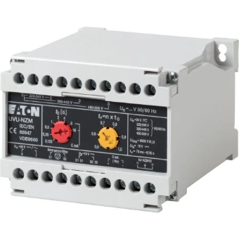 Optionele accessoires voor de vermogensschakelaars uit de serie NZM bieden een uitgebreid assortiment toepassingsopties voor gebruik wereldwijd. De montage is altijd flexibel en eenvoudig dankzij de modulaire functiegroepen. Opmerkingen: combinatie van afzonderlijke vertragingseenheid en speciale uitgaven. Voor gebruik met nooduitschakelapparaten in combinatie met de nooduitschakelingsknop. Niet-UL/CSA-goedgekeurd. Spanningsdalingen kleiner dan de instelling tussen 0,06-16 s veroorzaken geen afschakeling van de NZM vermogensschakelaar of N lastscheider. Vertragingstijd kan worden ingesteld: 70 ms - 4 s. Met externe condensator: 30.000 µF ≧ 35 V tot 8 s, 90.000 µF ≧ 35 V tot 16 s