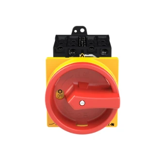 Hoofdschakelaar, Assortiment: hoofdschakelaar, onderhoudsschakelaar, Werkschakelaar, Familie type: T3, Stopfunctie: nooduitfunctie, Met rode draaigreep en gele borgring, 9-polig, Beschermingsgraad: Front IP65, uitvoering: tussenbouw, schakelhoek: 90 °, Motorvermogen AC-23A, 50 - 60 Hz 400 V: P = 15 kW, nominale ononderbroken stroom: Iu = 32 A, 5 schakelkamer(s), Normen en bepalingen: IEC/EN 60947, VDE 0660, IEC/EN 60204, CSA, UL, lastscheider volgens IEC/EN 60947-3