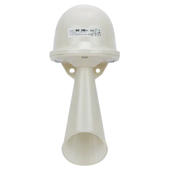 De Grothe signaalhoorn type 651 is ontworpen voor buitenshuis gebruik en heeft een lange hoorn met een hoog volume, met een geluidssterkte van 100 dB op 1 meter. De belopening biedt optimale klankconcentratie en de hoorn is gemaakt van witte slagvaste kunststof, met een waterdichte membraandoorvoer voor kabelinvoer. Dit model beschikt over een uitstelfunctie van 5 minuten en is geschikt voor constante belasting en gelijkstroom. De behuizing heeft een beschermklasse van IP 54, wat het geschikt maakt voor gebruik buitenshuis. De afmetingen van de hoorn zijn 345 x 150 x 165 mm.