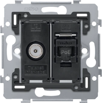 Mechanisme met RJ45-aansluitpunt UTP Cat. 6A, klaar voor PoE++ en coaxaansluiting. Het RJ45-aansluitpunt UTP Cat. 6A, klaar voor PoE++ dient om netwerkverbinding te maken voor telefonie, Ethernet, IP, PoE of internettoepassingen. Alle aansluitpunten van het mechanisme worden in sterconfiguratie aangesloten op de centrale aansluitkast met behulp van een kabel van hetzelfde performantietype. De sokkel heeft binnenafmetingen 45 x 45 mm en buitenafmetingen 71 x 71 mm en is voorzien van schroefbevestiging. Een afwerkingsset in een kleur naar keuze moet afzonderlijk besteld worden. Er is een PoE-adapter nodig om zowel data als voeding via de connector te geleiden. Een PoE-adapter kan zowel een PoE-injector als een PoE-splitter zijn. Een afwerkingsset in een kleur naar keuze moet afzonderlijk besteld worden. Ziggo goedgekeurd. Dit artikel wordt beschermd door ten minste één octrooi (aanvraag). Zie www.niko.eu/innovation voor meer informatie over octrooien.