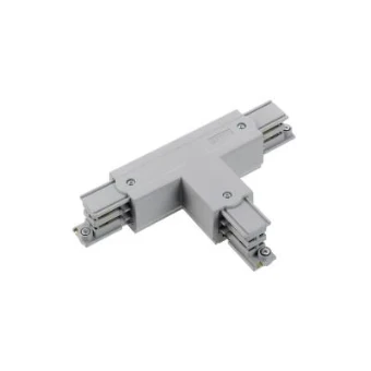 T-koppelstuk voor drie driefasespanningsrailsegmenten. Locatie van de polariteit rechts (R), zie rode markering in de maatschets. kleur grijs (vergelijkbaar met RAL 7040). Afmetingen (L x B x H): 100 mm x 66 mm x 32,5 mm.