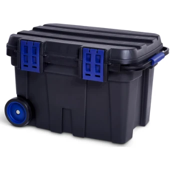 Grote mobiele opbergkoffer voor opslag en transport van grote gereedschappen en toebehoren. Gebruiksvriendelijk ontwerp met 2 wielen en draaggreep, 2 uitneembare inzetbakken en kliksluitingen. Gereedschap kan bevestigd worden aan de binnenkant van de deksel.
