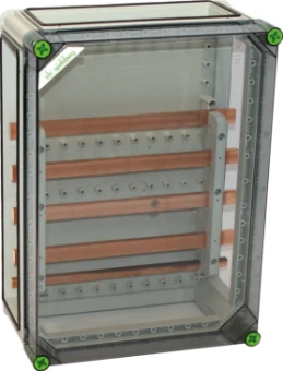 Railkastbehuizing met extra aansluitruimte, railkast system, 5-polig, zonder klem, naar eigen inzicht in te delen, met transparante deksel, incl. 3 x koppelstuk voor behuizingen (GGV), met railsysteem 5-polig 400A, met Cu-rail, L1...L3: 20 x 10mm, N: 20 x 10mm, PE: 12 x 10mm