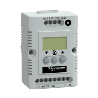 ClimaSys - CC elektronische hygrostaat met OLED scherm. H = 85 x B = 56 x D = 44 mm. Geeft de relatieve vochtigheid weer. 6 klemmen 2,5 mm² elektrische aansluiting. 2 uitgangen verwarmingsfunctie. De ingangsspanning is 200 tot 240 V. Vochtigheidsbereik is 20...80%. Hysterese 3 %. Polycarbonaat vervaardigd, zelfdovend overeenkomstig UL94 (materiaal V0). Lichtgrijs. Montageplaats is op montageplaat, 35 mm DIN-rail, Spacial stijl of dwarsrails.
