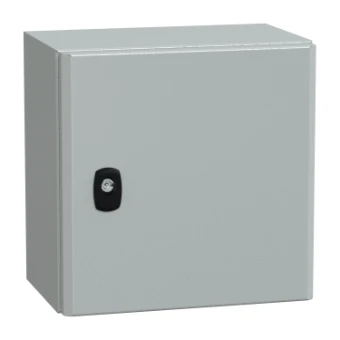 Spacial S3D - Wandgemonteerde stalen behuizing met volle deur. 300 x 200 x 150 mm. Gemaakt in staal met epoxy-polyester poederafwerking in RAL 7035 grijs. Deze behuizing biedt een hoge mate van bescherming tegen binnendringing en botsing met IP66 en IK10. Het bestaat uit een robuust lichaam uit één stuk met gootvormig voorprofiel met dubbele vouw. De deur, die is voorzien van 3 mm dubbelbaard slot, is gemakkelijk te verwijderen en omkeerbaar. Te gebruiken met een breed scala aan accessoires. Rechtstreeks aan de wand bevestigd of met bevestigingsschoenen (afzonderlijk te bestellen). De behuizing voldoet aan de richtlijnen IEC 62208 en UL508A, gecertificeerd door LCIE respectievelijk UL. Voldoet ook aan de maritieme vereisten van BV Marine Division, Lloyd’s Register en DNV-GL. De verpakking is na assemblage herbruikbaar. De toegankelijkheid voor bediening is vanaf de voorzijde