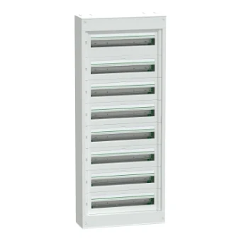 Deze Prismaset S-behuizing is een opbouwmontage distributiebehuizing. Deze metalen en kunststof behuizing is samengesteld uit 8 rijen van 24 modules van 18mm. Het kan alle types van modulaire schakeluitrustingen omvatten. Het omhulsel heeft een grotere ruimte op de eerste rij om de NSXm 160 binnenkomende stroomonderbreker of schakelaar aan te passen, indien nodig uitgerust met een aardlekbeveiligingsmodule. Dit omhulsel is bestemd voor installatie binnen. De IP-beschermingsgraad is IP41 met deur en IP30 zonder deur. Er kan een optionele deur over de behuizing worden geïnstalleerd. De kleur van de kast en de voorzijde is wit (RAL 9003). Dit gebruiksklare omhulsel is bedoeld voor gebruik in residentiële en tertiaire sectoren. Het is ontworpen voor elektriciens, en biedt ergonomie en flexibiliteit van de installatie. De kabels kunnen via de boven- of onderzijde van het omhulsel worden ingevoerd door verwijderbare kabelinvoerplaten. Het maakt invoer via kabel, buis of koker mogelijk. De be