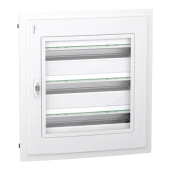 Deze Prismaset XS behuizing is een inbouwmontage distributiebehuizing. Deze metalen en kunststof behuizing is samengesteld uit 3 rijen van 24 modules van 18mm. Het kan alle types van modulaire schakeluitrustingen omvatten. Dit omhulsel is bestemd voor installatie binnen. De IP-beschermingsgraad is IP40 gesloten deur. De deur is transparant en kleurloos. De kleur van het omhulsel en de afdekplaat is wit (RAL 9003). Dit gebruiksklare omhulsel is bedoeld voor gebruik in residentiële en tertiaire sectoren. Het is ontworpen voor elektriciens, en biedt ergonomie en flexibiliteit van de installatie. De kabels kunnen via de boven- of onderzijde van het omhulsel worden ingevoerd door verwijderbare kabelinvoerplaten. Het maakt invoer via kabel of buis mogelijk. Het is uitgerust met 1 achterplaat en 3 DIN rails. De rails zijn verwijderbaar en vereenvoudigen de bedrading en de onderhoudswerkzaamheden. Het wordt geleverd met 1 aardingsklemmenblok. Dit klemmenblok biedt 24 uitgangen (3x25mm² + 21x4m