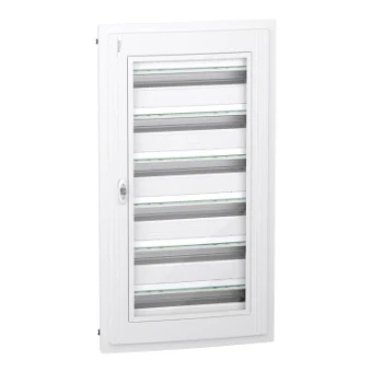 Deze Prismaset XS behuizing is een inbouwmontage distributiebehuizing. Deze metalen en kunststof behuizing is samengesteld uit 6 rijen van 24 modules van 18mm. Het kan alle types van modulaire schakeluitrustingen omvatten. Dit omhulsel is bestemd voor installatie binnen. De IP-beschermingsgraad is IP40 gesloten deur. De deur is transparant en kleurloos. De kleur van het omhulsel en de afdekplaat is wit (RAL 9003). Dit gebruiksklare omhulsel is bedoeld voor gebruik in residentiële en tertiaire sectoren. Het is ontworpen voor elektriciens, en biedt ergonomie en flexibiliteit van de installatie. De kabels kunnen via de boven- of onderzijde van het omhulsel worden ingevoerd door verwijderbare kabelinvoerplaten. Het maakt invoer via kabel of buis mogelijk. Het is uitgerust met 1 achterplaat en 6 DIN rails. De rails zijn verwijderbaar en vereenvoudigen de bedrading en de onderhoudswerkzaamheden. Het wordt geleverd met 1 aardingsklemmenblok. Dit klemmenblok biedt 48 uitgangen (6x25mm² + 42x4m