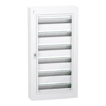 Deze Prismaset XS behuizing is een opbouwmontage distributiebehuizing. Deze metalen en kunststof behuizing is samengesteld uit 6 rijen van 24 modules van 18mm. Het kan alle types van modulaire schakeluitrustingen omvatten. Dit omhulsel is bestemd voor installatie binnen. De IP-beschermingsgraad is IP40 gesloten deur. De deur is transparant en kleurloos. De kleur van het omhulsel en de afdekplaat is wit (RAL 9003). Dit gebruiksklare omhulsel is bedoeld voor gebruik in residentiële en tertiaire sectoren. Het is ontworpen voor elektriciens, en biedt ergonomie en flexibiliteit van de installatie. De kabels kunnen via de boven- of onderzijde van het omhulsel worden ingevoerd door verwijderbare kabelinvoerplaten. Het maakt invoer via kabel, buis of koker mogelijk. Het is uitgerust met 1 achterplaat en 6 DIN rails. De rails zijn verwijderbaar en vereenvoudigen de bedrading en de onderhoudswerkzaamheden. Het wordt geleverd met 1 aardingsklemmenblok. Dit klemmenblok biedt 48 uitgangen (6x25mm²+
