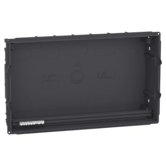 Dit Resi9 MP-product is een behuizingsbasis voor inbouwbehuizingen. De kabel is bedoeld voor een behuizing met 1 rij van 18 modules van 18 mm en zonder klemmenblok. Het is bedoeld voor nieuwe of gerenoveerde installatie in woningen. De afmetingen zijn (B) 378 mm x (H) 228 mm x (D) 98 mm. De inbouwdiepte is 80 mm. Dit product voldoet aan de IEC 60695-2-11- en EN 50102-normen. De beschermingsgraad is IK07. Het materiaal is technisch bestendig tegen brand en abnormale hitte tot 650°C. De bedrijfstemperatuur is van -25°C tot 60°C.