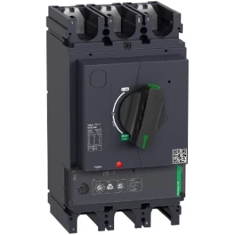 TeSys GV - Vermogensschakelaar - 3P - 500A/690V - Voor bescherming van 3-fase motoren: 200-250kW@400V. De kabel biedt thermische magnetische beveiliging en extra bescherming, uitschakelvermogen Icu 70kA, start-stop bediening met draaibediening, aansluiting voor rails of kabels met kabelschoenen (directe aansluiting van kabels met extra connectoren). Thermische beveiliging instelbaar via wijzerschalen met een instelstroom Ir in bereik 250-500A en een selecteerbare uitschakelklasse 5, 10 of 20, magnetische beveiliging bij 13 In. Extra beveiligingen met vaste pick-up zijn onder andere bescherming tegen kortstondige vertraging Isd bij 13 Ir, faseonbalans en verliesbescherming. Deze kaart stelt interne locaties beschikbaar voor extra hulpcontactblokken (OF, SD) en spanningsuitschakelunits (MN, MX). Multi-standaarden gecertificeerd (IEC, UL, CSA, CCC, EAC, Marine), Green Premium-conform (RoHS/REACh).