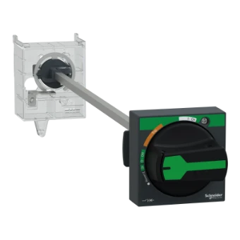 TeSys GV - Verlengde draaibediening voor vermogensschakelaars GV3L, GV3P in een behuizing en extern bediend. Voor het gebruik van de hoofdschakelaar heeft deze een zwarte hendel op een grijze voorplaat met aanduiding van 3 standen OFF, ON, TRIP. Om op de deur van de behuizing te worden gemonteerd, zorgt het handwerkmechanisme voor een IP54-bescherming tegen de montage. Het omvat ook een montageadapter die aan de voorkant van de vermogensschakelaar moet worden geschroefd en een verlengas die in lengte moet worden aangepast (de afstand tussen de deur en de achterkant van de vermogensschakelaar moet tussen 189 en 300 mm liggen). Vergrendelbaar in UIT- of AAN-stand met max. 3 hangsloten (afzonderlijk te bestellen). Vergrendeling in de AAN-stand betekent niet dat de stroomonderbreker niet kan uitschakelen (ontgrendeling is vereist voor het resetten van fouten). Green Premium-conform (RoHS/REACh).