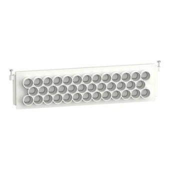 Dit Prismaset XS product is een kabelplaat met buisingang. Het apparaat is bedoeld voor installatie in een oppervlaktebehuizing met een breedte van 18 modules. Het kan boven- of onderaan het omhulsel worden gemonteerd. De IP-beschermingsgraad is IP40. Het heeft 26 buisingangen en is gemaakt van kunststof. Is kleur wit (RAL 9003). De weerstand van het kunststof tegen vlammen en abnormale warmte is 650 °C. De totale afmetingen zijn (B) 332mm x (H) 23mm x (D) 140mm. Zijn gewicht is 400g.