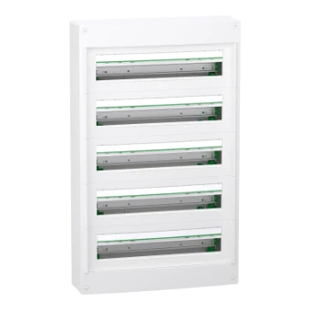 Deze Prismaset XS behuizing is een opbouwmontage distributiebehuizing. Deze metalen en kunststof behuizing is samengesteld uit 5 rijen van 24 modules van 18mm. Het kan alle types van modulaire schakeluitrustingen omvatten. Dit omhulsel is bestemd voor installatie binnen. De IP-beschermingsgraad is IP40 met deur en IP30 zonder deur. Er kan een optionele deur over de behuizing worden geïnstalleerd. De kleur van de kast en de voorzijde is wit (RAL 9003). Dit gebruiksklare omhulsel is bedoeld voor gebruik in residentiële en tertiaire sectoren. Het is ontworpen voor elektriciens, en biedt ergonomie en flexibiliteit van de installatie. De kabels kunnen via de boven- of onderzijde van het omhulsel worden ingevoerd door verwijderbare kabelinvoerplaten. Het maakt invoer via kabel, buis of koker mogelijk. Het is uitgerust met 1 achterplaat en 5 DIN rails. De rails zijn verwijderbaar en vereenvoudigen de bedrading en de onderhoudswerkzaamheden. Het wordt geleverd met 1 aardingsklemmenblok. Dit kl