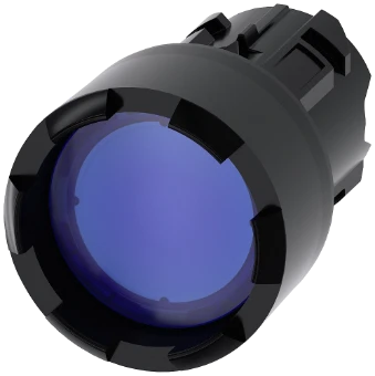 Illuminated pushbutton, 22 mm, round, plastic, blue, Front ring, raised, castellated, momentary contact type, with laser labeling, symbol number according to, ISO 7000 or IEC 60417 Illuminated pushbuttons SIRIUS ACT for switching and controlling electrical loads. Under the brand name SIRIUS ACT, Siemens offers a unique portfolio of pushbuttons and signaling devices with global product approvals in three modern design lines of rugged genuine metal and high-grade plastic.An innovative snap-on concept makes the task of installing a unit so easy that it can be done with one hand and without any special tools. Groove-free holes are adequate as mounting holes since full twist prevention is already integrated.Thanks to the high degree of protection throughout, the rugged devices are suitable for use in industry and outdoors. Even cleaning with a high-pressure jet is possible. Neither dust, oils, nor caustic solutions can interfere with reliable operation.As well as standard wiring, the devices can also be connected to the controller via PROFINET, AS-Interface or IO-Link. Doing so will help you to reduce wiring time and effort, minimize error sources and have more flexibility.The graphical Online Configurator provides convenient support when selecting and ordering individual devices, enclosures and labels. Extensive documentation (e.g. manual, 3D data, terminal diagram) is available. Versions available: Several colors, illuminated/non-illuminated, with/without inscription, latching/momentary contact operation, various button and front ring heights. Note: Single device, please order holders and modules separately. SIRIUS ACT - Performance in action for control and signalling. Simply mounted, simply strong, simply perfect.