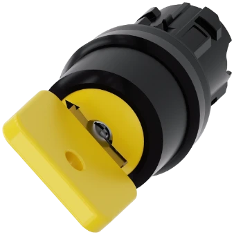 Key-operated switch O.M.R, 22 mm, round, plastic, lock number 73033, yellow, with 2 keys, 2 switch positions O-I, latching, actuating angle 90°, 10:30h/13:30h, Key removal O+I Key-operated switches SIRIUS ACT for meeting higher demands for access security. Under the brand name SIRIUS ACT, Siemens offers a unique portfolio of pushbuttons and signaling devices with global product approvals in three modern design lines of rugged genuine metal and high-grade plastic.An innovative snap-on concept makes the task of installing a unit so easy that it can be done with one hand and without any special tools. Groove-free holes are adequate as mounting holes since full twist prevention isalready integrated.Thanks to the high degree of protection throughout, the rugged devices are suitable for use in industry and outdoors. Even cleaning with a high-pressure jet is possible. Neither dust, oils, nor caustic solutions can interfere with reliable operation.As well as standard wiring, the devices can also be connected to the controller via PROFINET, AS-Interface or IO-Link. Doing so will help you to reduce wiring time and effort, minimize error sources and have more flexibility.The graphical Online Configurator provides convenient support when selecting and ordering individual devices, enclosures and labels. Extensive documentation (e.g. manual, 3D data, terminal diagram) is available. Versions available: Various locking systems (Siemens, C; Siemens, B; RONIS, OMR), 2/3 switch positions, latching/momentary-contact operation, various key removal positions. Note: Single device, please order holders and modules separately. SIRIUS ACT - Performance in action for control and signalling. Simply mounted, simply strong, simply perfect.