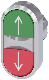 Illuminated twin pushbutton, 22 mm, round, metal, shiny, red: arrow pointing up, green: arrow pointing down, pushbuttons, flat Twin pushbuttons SIRIUS ACT for implementing two momentary contact type switching functions in one command point. Under the brand name SIRIUS ACT, Siemens offers a unique portfolio of pushbuttons and signaling devices with global product approvals in three modern design lines of rugged genuine metal and high-grade plastic.An innovative snap-on concept makes the task of installing a unit so easy that it can be done with one hand and without any special tools. Groove-free holes are adequate as mounting holes since full twist prevention is already integrated.Thanks to the high degree of protection throughout, the rugged devices are suitable for use in industry and outdoors. Even cleaning with a high-pressure jet is possible. Neither dust, oils, nor caustic solutions can interfere with reliable operation.As well as standard wiring, the devices can also be connected to the controller via PROFINET, AS-Interface or IO-Link. Doing so will help you to reduce wiring time and effort, minimize error sources and have more flexibility.The graphical Online Configurator provides convenient support when selecting and ordering individual devices, enclosures and labels. Extensive documentation (e.g. manual, 3D data, terminal diagram) is available. Versions available: Various color combinations, illuminated/non-illuminated, with/without inscription, various button heights. Note: Single device, please order holders and modules separately. SIRIUS ACT - Performance in action for control and signalling. Simply mounted, simplystrong, simply perfect.
