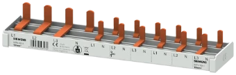 compact Pin Busbar, 10mm2 connection: 3p/N (RCCB N-right) 1x RCCB 4-pole + 6x compact device 1MW touch protected 10 MW cuttable Pin busbar SENTRON 5ST3 as additional components for residual current devices and miniature circuit breakers. These additional components can be mounted universally. They are easy and convenient to install and connect. Thanks to the standard touch protection, safety is reliably ensured during installation. Optimized technology for your safety - only from Siemens.