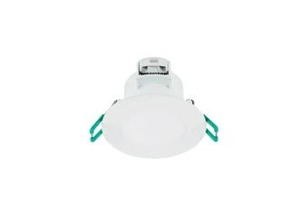 Integrated LED recessed spotlight, fixed, non dimmable, 3 CCT 2700K-3000K-4000K, 100° degree beam angle, polycarbonate white body, low profile 47mm recessed depth, IP65 from the front, IK03, loop-in/loop-out terminals for fast wiring, 87mm bezel diameter, 68-74mm cutout, frosted lens. Additional silver or black bezel can be ordered as accessory.