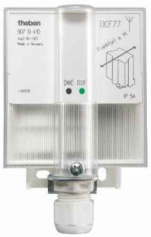 Tijdsynchronisatie met DCF-antenne voor top2-apparaten. Om een goede ontvangst te realiseren, moet de antenne niet in de kelder of in de verdeelkast worden gemonteerd. Voor de aansluiting wordt een aparte 2-aderige, niet-afgeschermde sterkstroomkabel (max. 100 m) gebruikt, waarop max. 5 Theben-apparaten kunnen worden aangesloten. Ompoling, kortsluiting en onderbreking van de antennekabel worden telkens optisch weergegeven.,