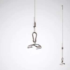 Draadophanging met bevestigingsklem uit roestvast staal, verzinkte staaldraad (Ø 1,5 mm), karabijnhaak en trapeziumhaakophanging. De afhanghoogte is eenvoudig en flexibel te regelen. Te gebruiken in combinatie met de draagprofielen E-Line 07650.... Besteleenheid bevat 1 stuk.