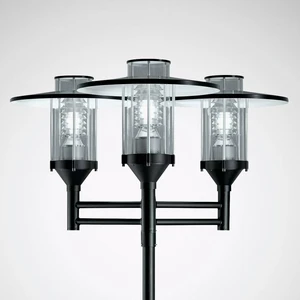 Mastopzetstuk, 3-voudig. Uit gelaste, verzinkte staalbuis. Voor armatuurtype 98... . Masttop Ø 76 mm. Kleur buitenzijde diepzwart, vergelijkbaar met RAL 9005. Met driepolige aansluitklem voor bedrading tot 2,5 mm² en trekontlasting.