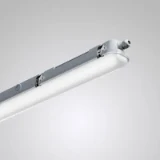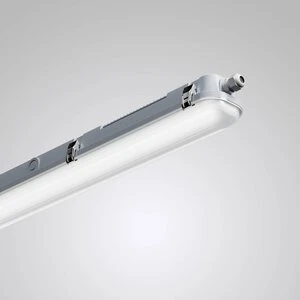 Waterdichte armatuur met armatuurbehuizing uit PC en diffusor uit PC. Met doorvoerbedrading 5 x 2,5 mm2. Aanbevolen voor omgevingen waarin er hogere eisen gesteld worden aan de mechanische stabiliteit. Conform DIN 10500. Met veersluitingen voor montage van de armatuureenheid en de armatuurbehuizing overeenkomstig de beschermklasse. Voor plafond-, wand- en pendelmontage. Variabele bevestigingsafstand dankzij verschuifbare bevestigingsklemmen op de armatuurbehuizing. Het bevestigingstoebehoren is meegeleverd. Montage met diefstalbeveiliging mogelijk door middel van meegeleverde schroeven. PC-diffusor met binnenliggende prismastructuur. Met Lambertiaanse lichtverdeling. Lichtkleur instelbaar in 2 stappen (Multilumen). Armatuurlichtstroom 6000 lm, aansluitvermogen 43 W, maximale lichtrendement van de armatuur 140 lm/W. Lichtkleur neutraal wit of daglichtwit, kleurtemperatuur (CCT) 4000 K of 6500 K, algemene kleurweergave-index (CRI) Ra > 80. Kleurplaatstolerantie (initial MacAdam) ≤ 5 SDCM. Knipperen: Pst LM ≤ 1,0 bij volledige belasting. Stroboscoopeffect: SVM ≤ 0,4 bij volledige belasting. Armatuurbehuizing uit PC. Oppervlak lichtgrijs (vergelijkbaar met RAL 7035). Afmetingen (L x B x H): x x . Beschermcategorie (EN 61140): I, beschermklasse (DIN EN 60529): IP65, slagvastheid overeenkomstig IEC 62262: IK08, testtemperatuur gloeidraadtest conform IEC 60695-2-11: 650 °C. Gewicht: 1,6 kg. Met 5-polige aansluitklem voor bedrading tot 2,5 mm2. Verscheidene opties om de voeding aan te sluiten. Aan de kopse zijde (2x), de achterzijde (5x), de zijkant (4x). Twee voorgemonteerde PG-kabelwartels aan de kopse zijde om de voeding aan te sluiten overeenkomstig de beschermklasse. Met elektronische transformator, digitaal dimbaar (DALI). De armatuur voldoet aan de fundamentele eisen van de van toepassing zijnde EU-richtlijnen en de productveiligheidswet. Ze is voorzien van een CE-markering. Bovendien heeft een onafhankelijk controlebureau het ENEC-certificaat toegekend aan de armatuur.