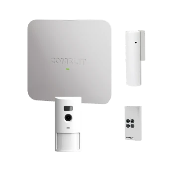 De draadloze inbraakbeveiligingskit KNCAM bestaat uit een centrale NEXUS (art. RFNEXUS), een magneetcontact met een extra bedrade ingang (art. RF1MCW), een infrarood binnensensor met ingebouwde camera (art. RF12PIRCAM) en een afstandsbediening (art. RF4KEYW). De centrale is uitgerust met geïntegreerde 4G-, WiFi- en ethernet-interfaces en kan worden beheerd vanuit de Comelit-app NEXUS via de cloud.