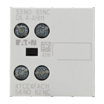 Module de contacts auxiliaires avec des contacts liés positivement, Éléments de contact selon EN 50005, Les combinaisons de la version E correspondent à EN 50011 et sont à privilégier, Le contacteur DC DILA(C)-22 ne doit être combiné qu’avec des contacts auxiliaires à 2 pôles., Fonction : pour applications standards, 2 pôles, Technique de raccordement : Borniers à vis, Courant assigné d’emploi AC-15 220 V 230 V 240 V : Ie= 4 A, Courant assigné d’emploi AC-15 380 V 400 V 415 V : Ie= 4 A, Contacts F = contacts à fermeture 1 contact F, Contacts O = contacts à ouverture 1 contact O, Type de montage : Fixation avant, Utilisation avec : DILA(C)…, DILM(C)7…, DILM(C)9…, DILM(C)12…, DILM(C)15…